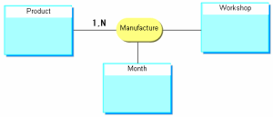 1,N : A product must be manufactured at minimum in 1 workshop over a period of 1 month. It can be manufactured in several workshops and/or over a period of several months (several workshop-month pairs).