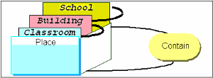 A classroom is contained in a building, which is contained in a school.