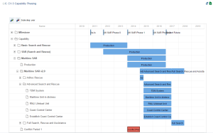 The Capability Phasing chapter presents a gantt chart. This chart shows in what way projects, through their deliverables, contribute to implementing the resource architectures that will support the capabilities. The rows represent the capabilities (derived from the CV-2 Capability Taxonomy model) and columns represent the phases defined in the Solution Master Plan.
