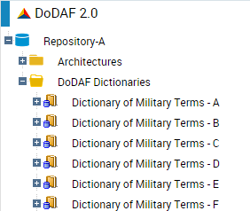 After import, the DoDAF dictionary is instantly available in the DoDAF 2.0 navigation window of the MEGA application.