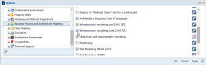 If after importing the MEGA Architecture framework you are unable to access artifacts and resource architectures, you will need to activate the "Business Process and Architecture Modeling / Infrastructure Modeling post-2009 SP2" option in the MEGA Options.