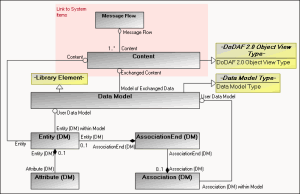 The logical data model metamodel is similar to the information model metamodel defined in the DIV-1 viewpoint. The sole difference is that in the logical data model metamodel the message flow connected to the content must exchange information between system items.