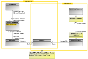 The OV-5 model describes the functional behaviors of the operational nodes. From the activities performed by these nodes result some messages (modeled by BPMN message flows that also carry information elements.