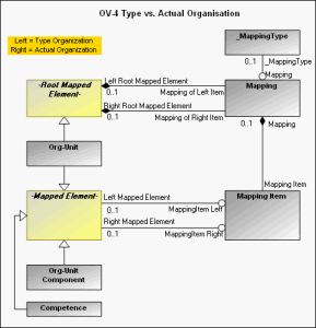 The OV-4 Metamodel also introduces the notion of a mapping between organizations defined at a type level and those defined as the actual organizations. These mapping allows for example to associate generic definitions to concrete organizations deployed in different geographical sites.