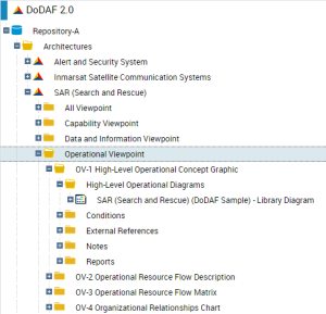 In the DoDAF 2.0 navigation window, the DoDAF architectures are found in the "Architectures" folder. Each architecture has eight main folders each of which corresponds to one of the eight DoDAF viewpoints: