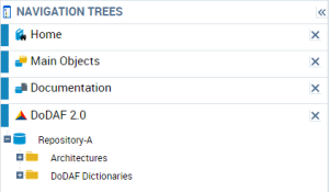 By default, the DoDAF 2.0 navigation window displays the repository in which the DoDAF architectures are located. It also contains an "Architectures" folder in which all the architectures of the current repository are located as well as a "DoDAF Dictionaries" folder which contains the official DoDAF terms and acronyms.