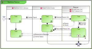 The figure below illustrates the "Maritime Rescue" system process which is involved in the performance of several tasks. These tasks are placed on the different participants which are more or less responsible for carrying them out. The different information exchanged between the tasks and the corresponding data flow is indicated in the diagram.