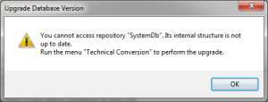 4. If a warning is displayed (You cannot access repository "SystemDb". Its internal structure is not up to date. Run the menu "Technical Conversion" to perform the upgrade):