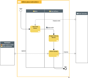 In this example, the business function architecture environment of the pizza-making company is made up of the historical business function architecture and its interactions with external partners: clients and suppliers. You can see in the diagram that delivery is outsourced to a third party deliver partner.