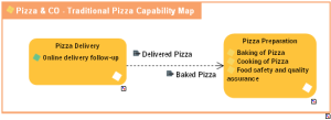 In this example, the business capability to deliver pizzas is based on the business capability to cook them.