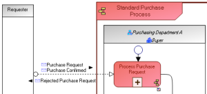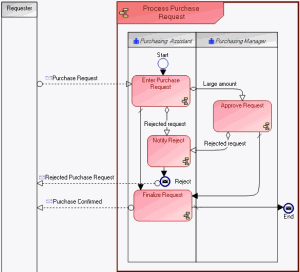 The example of purchase request processing involves several exchanges between the requester and the "Purchasing Assistant".
