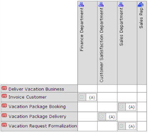 Cells of this matrix are filled with a letter representing responsibility of the org-unit in the process (or operation):