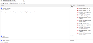 • The second part describes responsibilities of org-units. It presents detail of operations executed by the org-units and the processes for which it is responsible. This part also displays statistical data: maximum, minimum and average value of operations executed per org-unit, as well as equivalent values for assigned processes.