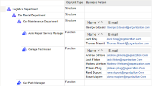 • The first part details organizational structure of each org-unit specified as parameter. In this part, the org-units analyzed are listed with their type, parent, sub-org-units, persons involved in execution of the tasks associated with the org-unit, including other information related to these persons. This part also displays statistical data: number of org-units, number of persons.