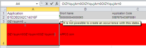 The wizard provides a report of import results in an Excel file. This file opens automatically, indicating in red any data that poses a problem. In the following example, the file has identified an application that exists in HOPEX but of which the identifier has been modified in the import file.