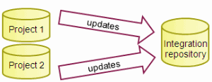 Modeling projects are initiated in distinct repositories. They are then transferred to an integration repository.