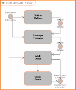 For example, a "Person" becomes visible in a media library after "Registration". It can be registered with state "Child", "Adolescent", "Adult" or "Senior". Passage from one state to another can be connected to a event, a "Birthday" for example.