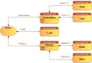For example, a person is associated with a mandatory and unique postal address, possibly an email address and one or more telephone numbers.