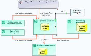 The "Equipment Purchasing" application used the "Inventory Management" application to consult and update information on spare parts stock levels. It also uses the "Purchasing Management" application with the "Catalog" database to send a purchase order.