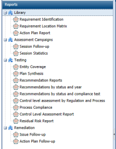 The Reports navigation tab groups reports used during each compliance management process step. They can provide help in decision-making and allow you to follow up progress of your work.