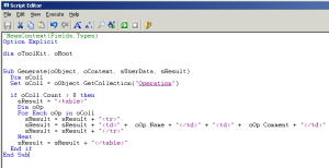 When the "Fields" context is activated, the VB script is pre-interpreted so that its fields can be replaced by expressions compatible with VB Script syntax. MetaClasses, MetaAttributes and MetaAssociationEnds can then be pasted in the script in the form of fields rather than the corresponding object names.
