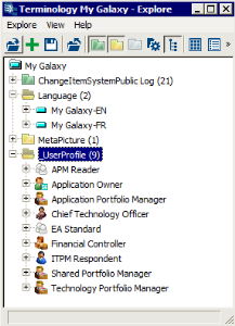 Terminology is a set of terms used in a specific context instead of the names used in basic configuration. This context can be a modeling standard (e.g.: Archimate, TOGAF), the vocabulary used in a specific field (e.g.: audit, internal control) or specific to the company.