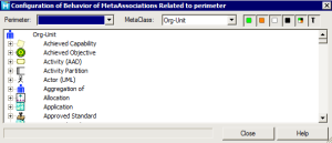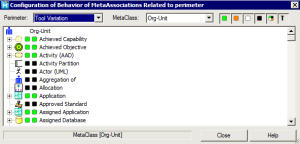 The Configuration of Behavior of MetaAssociations Related to Perimeter dialog box details for the selected MetaClass (here "Org-Unit") the behavior of the selected perimeter (here "Tool Variation") for each MetaClass concerned: