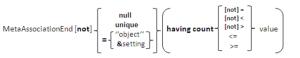 • Having count indicates the number of times the link must exist. For concatenated MetaAssociationEnds , the link reached by the first MetaAssociationEnd is the one counted.