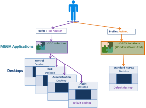 A user can connect to one or several desktops depending on his/her profile and authorizations. The user passes from one desktop to another by logoff/login or by using the MEGA Tool Desktop Switcher.