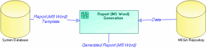 These report templates (MS Word) are stored in the MEGA system repository. This system repository contains all standard supplies that enable MEGA operation, for example report templates (MS Word), queries, Web site templates, etc.