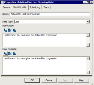 A steering date enables the scheduler parameterization: specification of date repeat, start and end date. It also enables specification of the message and/or the notification to be sent (initial, remind or last date).