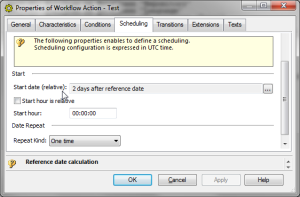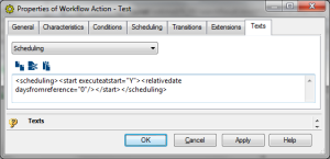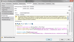 The MetaAttribute “Scheduling” is added on “Workflow Action” MetaClass. A MetaPropertyPage is added on “Workflow Action” MetaClass, this MetaPropertyPage includes a platform provided scheduling propertypage using this syntax: