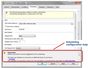 The scheduling property page is a graphical layer over the scheduling XML text format that enables easy edition/display of scheduling configurations.