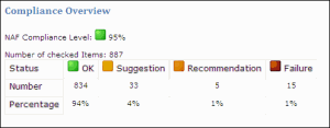 The NAF Regulation Compliance report begins with an overview of the level of compliance of architecture items with the regulation rules.