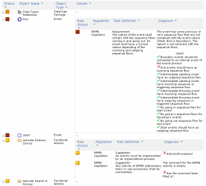 When the compliance of an object with a particular rule has been checked and the object complies with the rule, the status is marked as OK. If the object does not comply with a particular rule, it takes the rule level that has been defined for the rule (suggestion, recommendation or requirement).