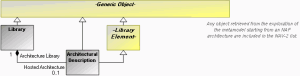 The integrated dictionary is composed of all items defined in the context of the Architectural Description object. From this object, the container library is retrieved via the Architecture Library association. The library is then explored to retrieve all contained items based on the HOPEX extraction tool. The dictionary is composed of these items.