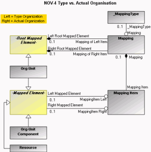 The NOV-4 metamodel also introduces the notion of a mapping between organizations defined at a type level and those defined as the actual organizations. These mapping allows for example to associate generic definitions to concrete organizations deployed in different geographical sites.