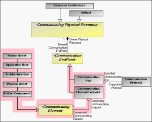The pink highlighted sections in the metamodel indicate the relationships used to create a communication path which is composed of two communication end points (either a communication port or any communicating element endpoint).