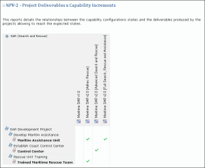 In NPV-2, programmes and projects are mapped to capabilities to show how the specific projects and programme elements help to achieve a NATO capability, as defined in a CP. Projects are mapped to the capability for a particular time period. Projects may contribute to multiple capabilities and may mature across time periods.