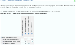 The Hierarchical Project Dependencies chapter shows the dependencies of projects in the architecture. This report allows you to use the subset parameters to generate appropriate sized tables. The projects are displayed according to the defined project hierarchy.