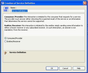 During the creation of the service definition, the creation wizard presents two types of roles: "Consumer / Provider" and "Emitter / Receiver".