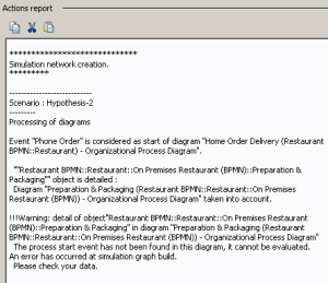 There is no start event in the organizational process diagram. If you do not specify the event to be taken into account to activate a described process, the following error message appears in the scenario report: