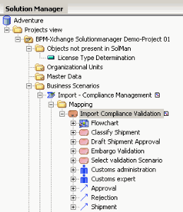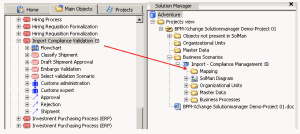 In the above example, an organizational process is mapped with a scenario. The sub-objects of the organizational process are displayed in the Solution Manager navigation window under the scenario, however, none of them are linked to any of the scenario’s sub-objects. The sub-objects must be explicitly mapped like the business object and the scenario, by dragging and dropping the business object sub-objects in the Mapping folder of the concerned scenario sub-object.