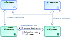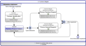 The "Information Request" exchange contract is used by the call center to take account of a customer request online. There are therefore three participants in this exchange contract: the customer, the IT applications and the customer representative who is the effective requester of the service (in this case the call center).