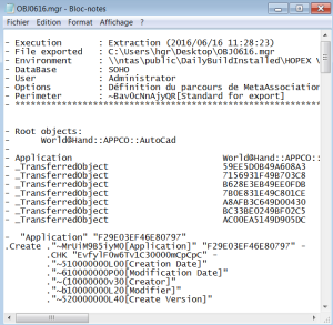 This file is presented in the form of a table showing a list of commands. Corresponding to each command ("Create", "Connect", etc.) there is a an object, object modification date and name of the last modifier.