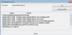 During export, the name and type of the objects being exported appear at the bottom of the dialog box, together with duration of export. On completion of export, the Execution Report displays the number of exported objects.