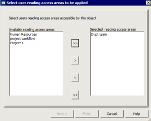 6. In the next dialog box, if an object reading access area corresponds to the user reading access areas, you are invited to validate this area, otherwise you must enter the name of a new user reading access area, which will be created corresponding to the previously selected user reading access areas.