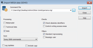 For command files with the MGL extension (log extraction or backup logfile), the absolute identifiers are included in the imported objects. The writing access levels are maintained if the updates are consistent with the writing access diagram for the environment.
