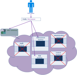 User Thomas KOCH with the Risk Assessor profile can connect only to the "Risk" and "Environment" desktops of the GRC Solutions application. The "Audit", "Control" and "Administration" desktops are not authorized.