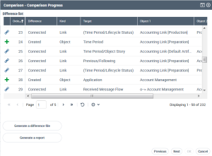 The Comparison Progress window opens. It presents the differences between compared objects and their modifications.